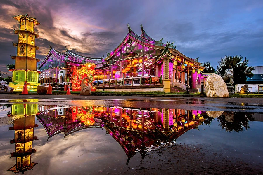 【光與影的魔幻世界,顛覆您對玻璃的想像】 位於彰化濱海工業區內的台灣玻璃館,將傳統工業轉化為令人驚豔的藝術體驗。這裡不只是展示玻璃製品,更是一個充滿創意的夢幻樂園。 最受矚目的莫過於全台唯一的「玻璃媽祖廟」——台灣護聖宮。整座廟宇從牆面、屋頂到裝飾,大量運用玻璃材質,白天晶瑩剔透,夜晚在燈光投射下更是璀璨奪目,展現出科技與信仰的完美結合。館內的「黃金隧道」利用鏡面反射原理,創造出無限延伸的迷幻空間。來到這裡,您將親眼見證台灣玻璃產業的精湛工藝與無限創意。